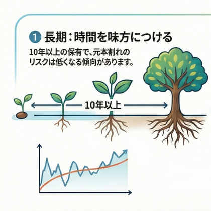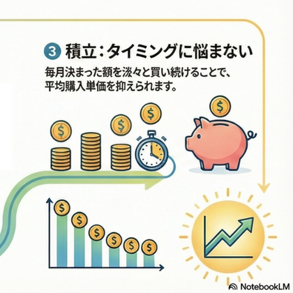 - 時間の分散(ドル・コスト平均法): 一度に買わず、毎月一定額をコツコツ買うことで、高い時に少なく、安い時に多く買うことができます。