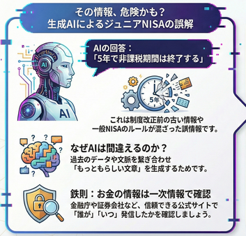 今週2人も「ジュニアNISAの5年経過タイミングで非課税期間が終了する」と生成AIに騙されたとの書き込みを見たので、制度を調べなおしたまとめ