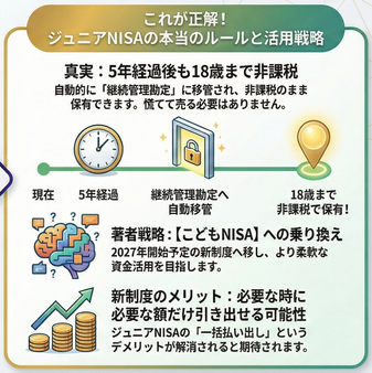 - 5年経ったら終わりではない: 5年の非課税期間が終わっても、18歳(※18歳を迎えた年末)までは、引き続き「継続管理勘定」という枠で非課税のまま保有できます。