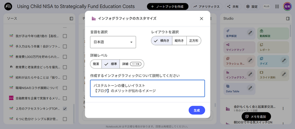 notebooklm(ノートブックLM)なら、書いた文章をソースとして放り込めば完成度の高い画像に仕上げてくれます\(^o^)/