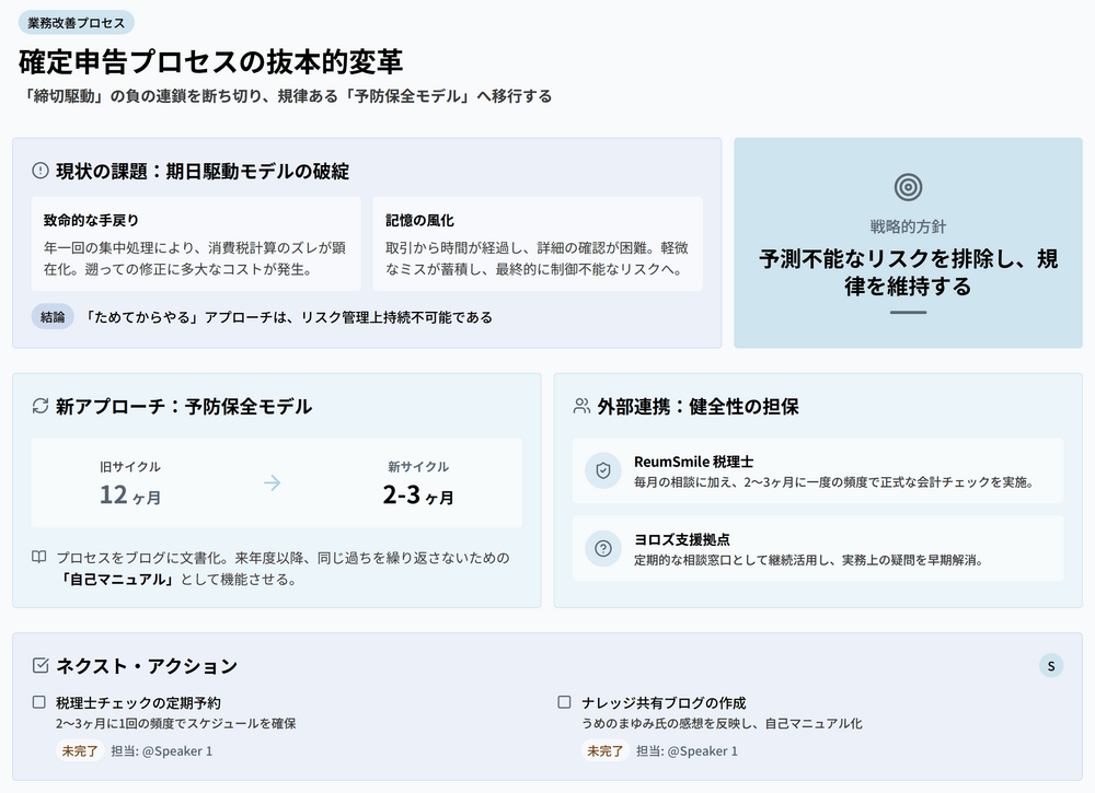 今後は、専門家(税理士)のチェックを定期的に組み込み、2〜3ヶ月に一度の頻度で会計処理を行う「予防保全モデル」へと移行する。