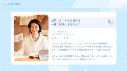 ご意見・ご感想 | スライドだけではわかりにくいところも、質問タイムを多く取っていただいたことや、質問しやすいように投げかけてくださったおかげで、『苦手』から『少し苦手』に変わった気がしています。(この『少し』だけでも大きな前進です笑) アーカイブがあるのもとてもありがたいです。 まずはアーカイブで今回教わったことを確認しながら、確定申告に向けてコツコツ入力頑張ります! このような機会を使っていただき、ありがとうございました。 |