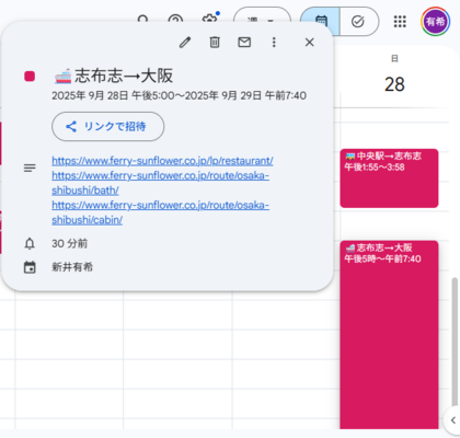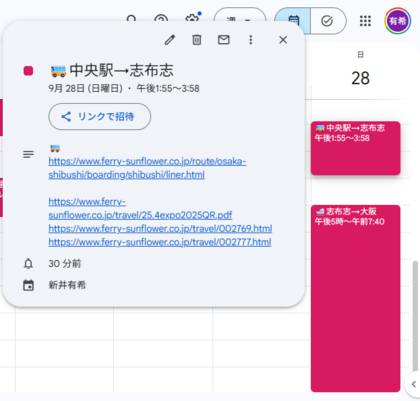 ↓こんな感じで、【予定】の【説明】部分に調べて、当日も再チェックしたいかもしれない内容についてはリンクを載せました!