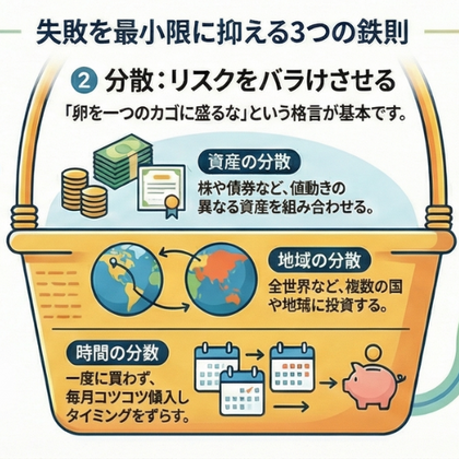 「卵を一つのカゴに盛るな」という投資の有名な格言があるように、投資先や購入タイミングを分散させることで、リスクを抑えることができます。