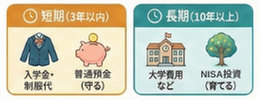 • 短期(3年以内に使うお金):近い将来の入学金や制服代など。「減っては困るお金」なので、いつでも出せる「普通預金」に(イメージは手前の棚)置きます。